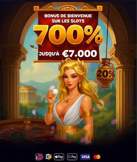 | Bonus de bienvenue | Pack d'accueil orienté machines à sous, personnalisable selon la promo en cours (jusqu'à 700 % et 7 000 € mentionnés sur la bannière). Cashback VIP disponible pour les comptes éligibles. |